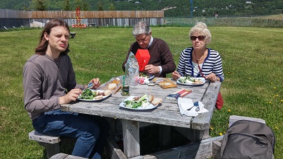 Dans le grand vent, nous engloutissons ma petite composition de restes. La vue est plutôt pas mal, la salade légère, tout est bien !