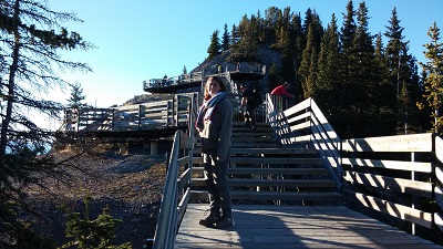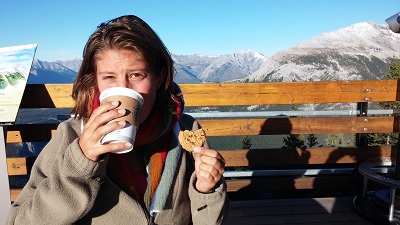 Heureusement, nous sommes du côté de la Sulphur Mountain et des hot springs… exactement ce que nous voulions voir. Ouf ! Nous parquons la voiture et ne sommes pas mécontents de reprendre la route, mais à pied cette fois ! La montagne est là, et pour voir la vue il faut gravir 600 mètres de dénivelé, ou payer le téléphérique la modeste somme de 25 dollars… Une grosse heure plus tard nous sommes en haut, dégustant un chocolat chaud (évidemment trop sucré) en admirant la vue.