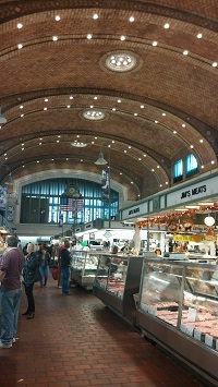 On ne traîne pas trop : Stefan nous attend dans le salon de l'auberge ! On décide de partir à la recherche de quelque chose de comestible puisqu'il est déjà pratiquement midi. Une averse survient et nous nous abritons dans un marché couvert immense : le "West side market", Cleveland's oldest public market. Déjà du tourisme et de l'histoire !!! Le bâtiment est super, et les étales...