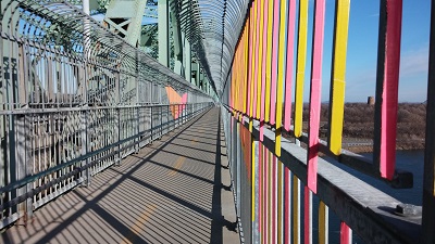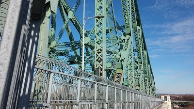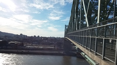Nous passons le long d'un beau bâtiment en pierre, un fort militaire, arsenal et hôpital suivant l'histoire, héritage des britanniques et de leur crainte face aux américains. Encore quelques pas, la route, les voitures, et l'accès au pont Jacques Cartier !