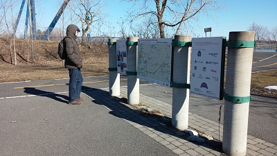 Nous entamons à pied une partie du sentier transcanadien, 23 000 km de sentiers récréatifs qui devraient joindre les océans atlantique, pacifique et arctique lors de sa finalisation (on en est à 80 pour cent !). De notre côté, nous en avons parcouru peut-être un sept millième, rien de bien glorieux, mais nous avons escaladé des barrières verouillées pour en suivre un bout ! D'accord, la barrière n'était pas bien haute, et alors que nous hésitions à enfreindre la loi, trois cyclistes ont fait passer leur vélo par-dessus !