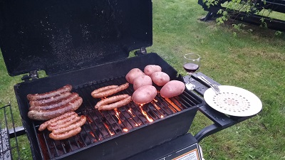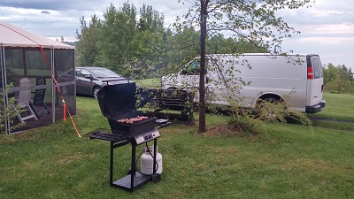 Mais tout est bien qui finit bien, et le mari de Caroline est là pour nous accueillir dans le chalet familial, derrière la maison de la grand-mère. La vue imprenable sur le Saint-Laurent est complètement bouchée par le pluie, mais qu'importe, Paul grille quand meme nos saucisses sur le barbecue !