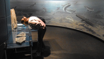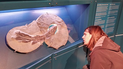 De midi à 17h00, le Centre de Miguasha va nous enchanter. Nous allons avoir la chance d'avoir une guide rien que pour nous ! Une dame super qui paraît assez contente de nous montrer le centre, car au lieu de l'heure de visite prévue, elle en reste trois avec nous. Nous pouvons lui poser toutes les petites et grandes questions qui nous viennent. De sa visite traditionnelle comportant dans chaque phrase : le plus ceci, le plus cela… elle se rend compte qu'elle peut un peu dévier, laisser les évocations aux « plus » quelque chose de côté, et nous emmener dans le monde fou de Miguasha il y a 400 millions d'années, époque où l'actuel Québec se trouvait sous l’équateur. On imagine donc que le contexte était légèrement différent. Dans cette grande mer et ce climat chaud se sont développés nombres de poissons… qui ont eu l'idée étrange d'aller se balader sur la terre ferme ! La preuve est là : leurs impressionnants fossiles. Il y en a même un qui montre encore ce que le poisson avait mangé… et un autre où on voit la trace des vaisseaux sanguins et des nerfs… OUI !