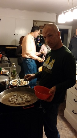 Jim fait rissoler tous ses ingrédients dans sa grande poêle espagnole tandis que nous essayons de comprendre ce que disent ses amis ! Les épouses sont bienveillantes et claires, les maris un peu plus inconscients et leur accent n'est pas facile à suivre ! Mais les plats défilent, l'alcool coule et la chaleur humaine fait le reste !