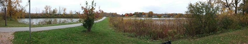 Nous traversons d'abord un immense parc aux grandes étendues de gazon et aux arbres rougeoyants, le long de la Genesee river et du canal qui s’emberlificotent en croisements, embouchures, rétrécissements... Les ponts qui surplombent ce spectacle ne sont pas tendres avec nos cuisses mais nous offrent une vue imprenable ! Des badeaux se promènent, certains sportifs courent... mais question vélo, on a vraiment la paix !