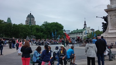 Puis, répondant à nos estomacs, nous décidons de prendre la direction de la ville basse. Sur notre chemin, nous passons devant l'école des ursulines — la plus vieille institution d’enseignement pour jeunes filles en Amérique du Nord ! — nous traversons le parvis de l'Hôtel de Ville où se tient un curieux événement : une hôtesse nous tend des tracts et nous explique que les chefs de grands restaurants de Québec, chacun dans leur stand, proposent des plats à déguster. Un carnet de cinq coupons ne coûte que vingt-cinq dollars, mais un rapide tour des exposants ne nous convainc pas : la nourriture proposée ne nous fait pas envie, et nous décidons de continuer notre chemin vers le Lapin Sauté.
