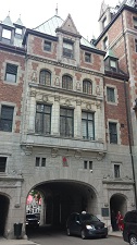 Une fois les données collectées, il est temps de visiter. Nous traversons donc le château par sa cour intérieure, où on peut voir une pierre datée de 1647, provenant du château de Saint-Louis et gravée d'une croix de Malte (le truc rouge au-dessus de l'arche sur la photo de droite), ainsi que des gens en livrée, et une tour vertigineuse de chambres : une nuit ici ne doit pas être dans nos moyens !