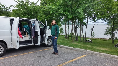 Nous payons notre repas, et il est déjà l'heure de reprendre la route : le seul pont ouvert est peut-être embouteillé, et nous ne voulons pas arriver trop tard à Rivière-du-Loup pour trouver un endroit sympathique où passer la nuit. Sur la route, nous nous arrêtons sur l'aire d'un centre d'informations pour touristes et squatons un peu leur wifi. Christine appelle Marie sur Skype, et finalement nous décidons de souper ici. J'installe la cuisine et touille la soupe lyophilisée, pendant que Christine prépare le reste du repas.