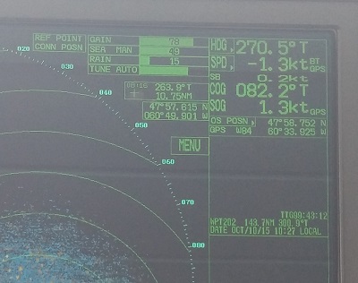 Mais arrêter un cargo de 220 mètres de long, quand le vent est à plus de 20 mètres par seconde, ça donne des choses aussi absurdes qu'un radar qui vous indique que votre vitesse est négative (comprendre "speed" pour SPD et "nœud" pour KT sur la photo).
