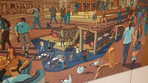 Une vision d'artiste des différentes strates de Montréal nous amuse le temps de comprendre où nous sommes. On peut observer les canalisations, le réseau souterrain, les couloirs du musée d'archéologie, le métro, les tunnels des voitures… Et au dessus de tout ça, les buildings qui défient le ciel !