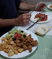 Les vagues n'ont pas l'air de préoccuper beaucoup notre équipage polonais désormais en week-end, et encore moins notre cuisinier qui nous prépare pour le soir un tartare de bœuf. À voir les assiettes des officiers nous avons peur de recevoir nous aussi l'équivalent d'une vache par personne, mais nous voyons arriver avec soulagement des assiettes plus petites. Soulagement de courte durée lorsque nous comprenons que si nous avons des assiettes plus petites, c'est parce qu'il ne s'agit que de l'entrée. Nous devons encore manger le plat, c'est-à-dire des nuggets de poulet et des pommes sautées (le tout préparé avec amour par notre chef cuisinier). Ajoutez à cela un feuilleté, une poire et une glace trois parfums (avec un biscuit, de la sauce chocolat, des fraises et pêches en pot...) et vous avez la recette miracle de notre cuistot pour que l'équipage se sente en vacances et dorme paisiblement jusqu'au dimanche matin. Entre les vagues et les repas c'est un entraînement intensif pour notre estomac ! Il faut pourtant rendre à César ce qui est à César, malgré les quantités invraisemblables qui nous sont servies, nous nous régalons. Entre les pierogi, les paupiettes de bœuf, les plats en sauce, les viandes, les poissons panés, les œufs brouillés, les pains perdus... On ne sait plus où donner de la bouche.