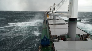 Ce samedi, dans le golfe du Saint Laurent, nous retrouvons des sensations du large : nous sommes arrachés à la sieste par les mouvements du bateau. C'est un samedi après-midi de tempête qui nous attend. Les vagues sont vraiment impressionnantes et certaines me donnent la sensation qu'elles vont briser le cargo. Et nous qui pensions que le plus gros était derrière nous ! Étonnamment, les vagues de 10 mètres que le bateau affronte maintenant nous donnent beaucoup moins le mal de mer que celles de six mètres qui soulevaient l'océan quelques jours auparavant. Apparemment, pour le bateau, ces vagues-ci, plus courtes, sont plus faciles à dépasser. Il n'empêche que de nouveau, involontairement, nous valsons sur les ponts.