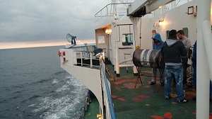 Heureusement, assez rapidement, la vie du bateau fait diversion et je vois arriver nos amis voyageurs et un homme d’équipage qui commence à lancer un feu dans un barbecue construit pour l’occasion dans une barrique de produit chimique… Il nous explique que si le bateau tangue c’est parce que le beau temps a calmé la surface de l’eau mais qu’une tempête a dû passer peu de temps auparavant. Il vient d’une petite ile proche de l’Allemagne et son père était marin. Il parle un anglais qu’il n’a pas appris à l’école mais qui est très convaincant.